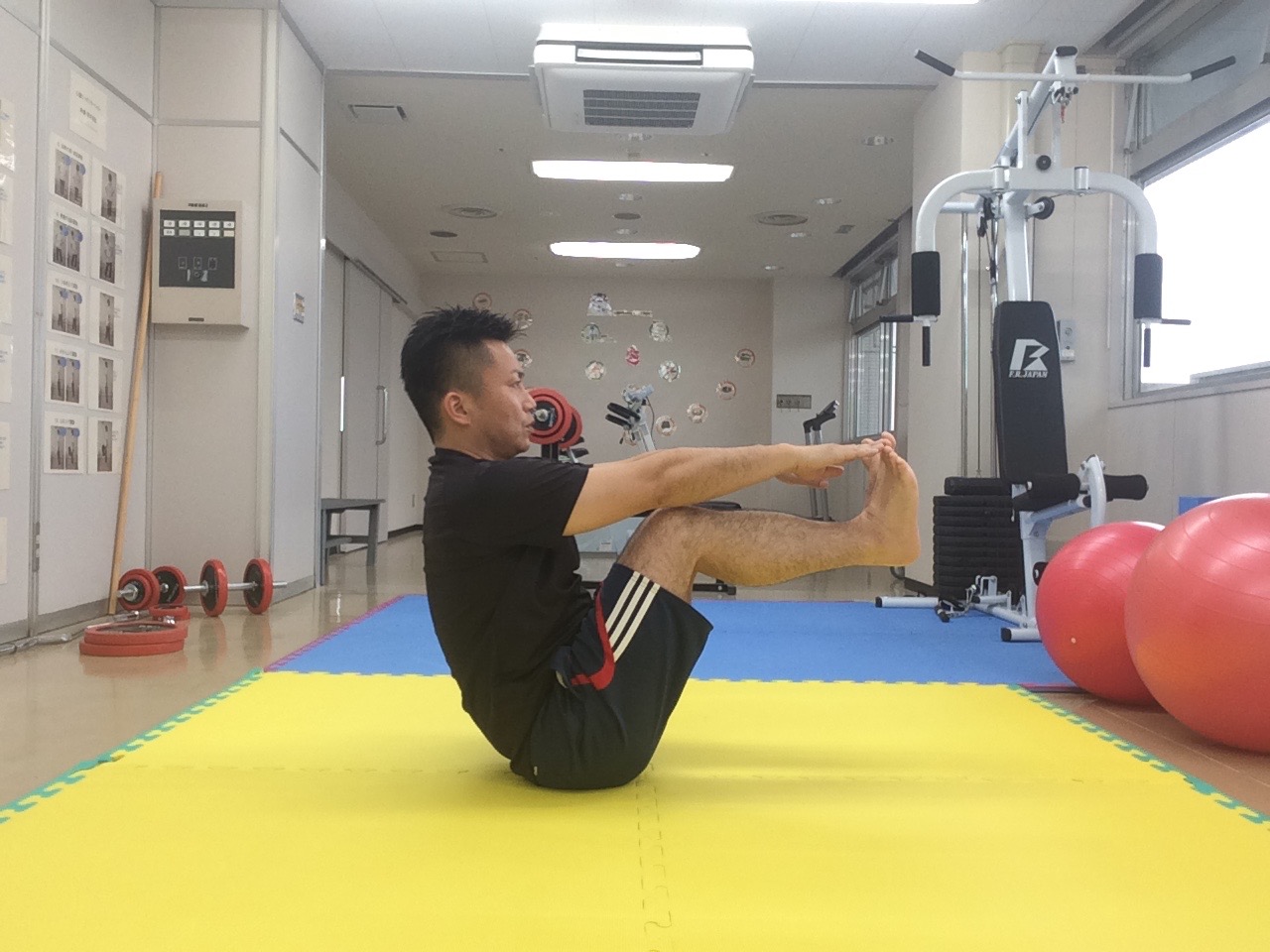 ①両手を後ろにつき、膝を曲げて座り片脚ずつ床から離していき