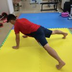 ①両手を肩幅程度に開き両手とつま先でカラダを支えます。